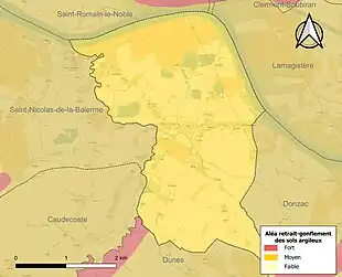 Le retrait-gonflement des sols argileux est susceptible d'engendrer des dommages importants aux bâtiments en cas d’alternance de périodes de sécheresse et de pluie[21]. La totalité de la commune est en aléa moyen ou fort (91,8 % au niveau départemental et 48,5 % au niveau national)[Carte 2]. Depuis le , en application de la loi ELAN, différentes contraintes s'imposent aux vendeurs, maîtres d'ouvrages ou constructeurs de biens situés dans une zone classée en aléa moyen ou fort[Note 4],[22].