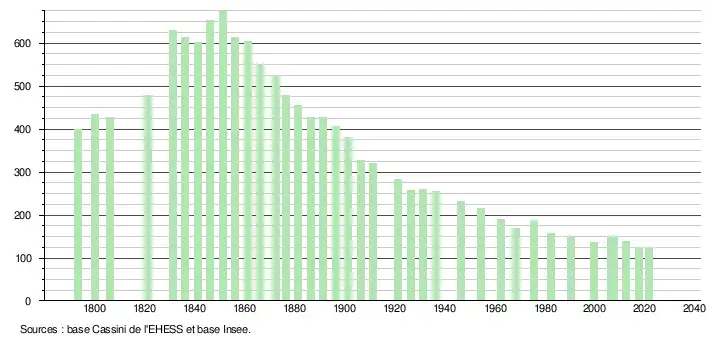 L'évolution du nombre d'habitants est connue à travers les recensements de la population effectués dans la commune depuis 1793. Pour les communes de moins de 10 000 habitants, une enquête de recensement portant sur toute la population est réalisée tous les cinq ans, les populations légales des années intermédiaires étant quant à elles estimées par interpolation ou extrapolation[22]. Pour la commune, le premier recensement exhaustif entrant dans le cadre du nouveau dispositif a été réalisé en 2007[23].