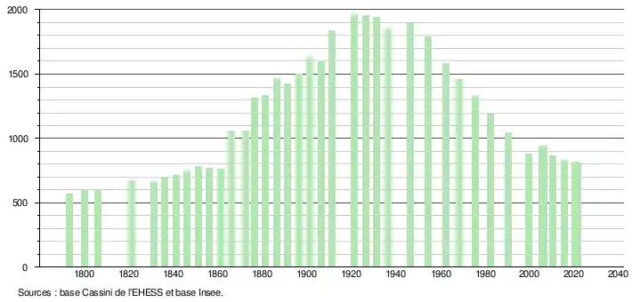 L'évolution du nombre d'habitants est connue à travers les recensements de la population effectués dans la commune depuis 1793. Pour les communes de moins de 10 000 habitants, une enquête de recensement portant sur toute la population est réalisée tous les cinq ans, les populations légales des années intermédiaires étant quant à elles estimées par interpolation ou extrapolation[23]. Pour la commune, le premier recensement exhaustif entrant dans le cadre du nouveau dispositif a été réalisé en 2005[24].