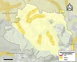 Le retrait-gonflement des sols argileux est susceptible d'engendrer des dommages importants aux bâtiments en cas d’alternance de périodes de sécheresse et de pluie[18]. 11,5 % de la superficie communale est en aléa moyen ou fort (27 % au niveau départemental et 48,5 % au niveau national métropolitain)[Carte 2]. Depuis le , en application de la loi ÉLAN, différentes contraintes s'imposent aux vendeurs, maîtres d'ouvrages ou constructeurs de biens situés dans une zone classée en aléa moyen ou fort[Note 3],[19].