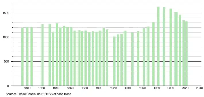 L'évolution du nombre d'habitants est connue à travers les recensements de la population effectués dans la commune depuis 1793. Pour les communes de moins de 10 000 habitants, une enquête de recensement portant sur toute la population est réalisée tous les cinq ans, les populations légales des années intermédiaires étant quant à elles estimées par interpolation ou extrapolation[36]. Pour la commune, le premier recensement exhaustif entrant dans le cadre du nouveau dispositif a été réalisé en 2007[37].
