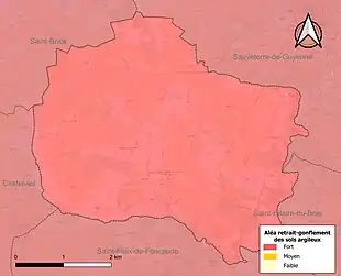Le retrait-gonflement des sols argileux est susceptible d'engendrer des dommages importants aux bâtiments en cas d’alternance de périodes de sécheresse et de pluie. La totalité de la commune est en aléa moyen ou fort (67,4 % au niveau départemental et 48,5 % au niveau national). Sur les 115 bâtiments dénombrés sur la commune en 2019, 115 sont en aléa moyen ou fort, soit 100 %, à comparer aux 84 % au niveau départemental et 54 % au niveau national. Une cartographie de l'exposition du territoire national au retrait gonflement des sols argileux est disponible sur le site du BRGM[17],[Carte 2].