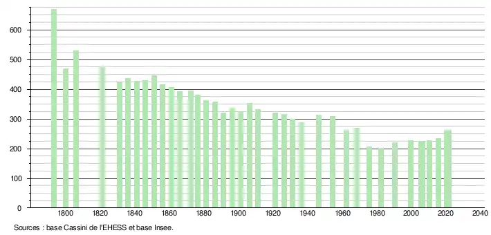 L'évolution du nombre d'habitants est connue à travers les recensements de la population effectués dans la commune depuis 1793. Pour les communes de moins de 10 000 habitants, une enquête de recensement portant sur toute la population est réalisée tous les cinq ans, les populations légales des années intermédiaires étant quant à elles estimées par interpolation ou extrapolation[23]. Pour la commune, le premier recensement exhaustif entrant dans le cadre du nouveau dispositif a été réalisé en 2005[24].