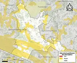Le retrait-gonflement des sols argileux est susceptible d'engendrer des dommages importants aux bâtiments en cas d’alternance de périodes de sécheresse et de pluie. 41,6 % de la superficie communale est en aléa moyen ou fort (33,6 % au niveau départemental et 48,5 % au niveau national). Sur les 277 bâtiments dénombrés sur la commune en 2019, 50 sont en aléa moyen ou fort, soit 18 %, à comparer aux 25 % au niveau départemental et 54 % au niveau national. Une cartographie de l'exposition du territoire national au retrait gonflement des sols argileux est disponible sur le site du BRGM[16],[Carte 2].