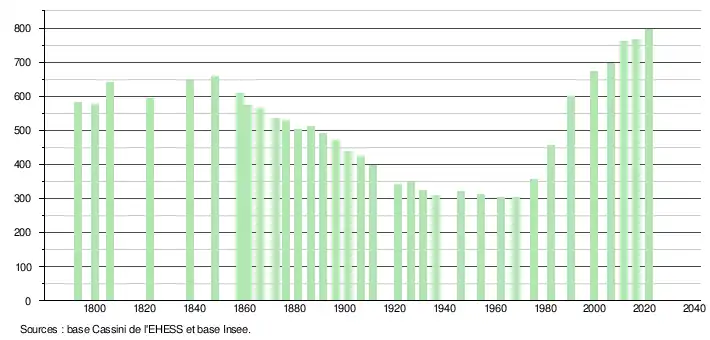 L'évolution du nombre d'habitants est connue à travers les recensements de la population effectués dans la commune depuis 1793. Pour les communes de moins de 10 000 habitants, une enquête de recensement portant sur toute la population est réalisée tous les cinq ans, les populations légales des années intermédiaires étant quant à elles estimées par interpolation ou extrapolation[8]. Pour la commune, le premier recensement exhaustif entrant dans le cadre du nouveau dispositif a été réalisé en 2006[9].