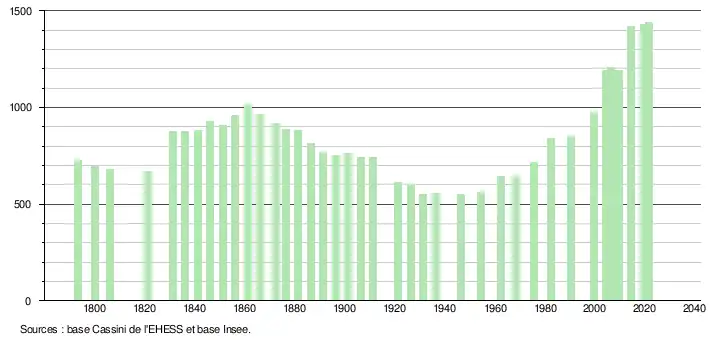 L'évolution du nombre d'habitants est connue à travers les recensements de la population effectués dans la commune depuis 1793. Pour les communes de moins de 10 000 habitants, une enquête de recensement portant sur toute la population est réalisée tous les cinq ans, les populations légales des années intermédiaires étant quant à elles estimées par interpolation ou extrapolation[16]. Pour la commune, le premier recensement exhaustif entrant dans le cadre du nouveau dispositif a été réalisé en 2004[17].