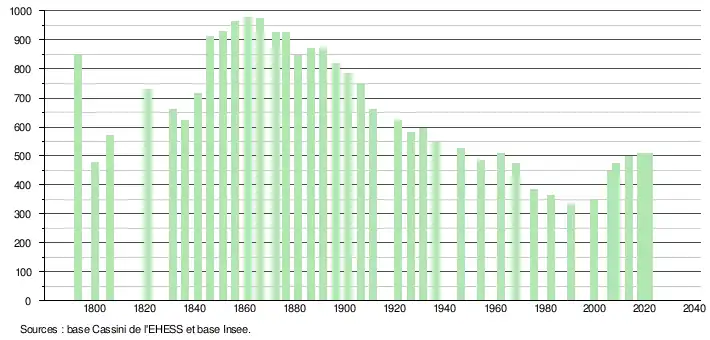L'évolution du nombre d'habitants est connue à travers les recensements de la population effectués dans la commune depuis 1793. Pour les communes de moins de 10 000 habitants, une enquête de recensement portant sur toute la population est réalisée tous les cinq ans, les populations légales des années intermédiaires étant quant à elles estimées par interpolation ou extrapolation[16]. Pour la commune, le premier recensement exhaustif entrant dans le cadre du nouveau dispositif a été réalisé en 2008[17].