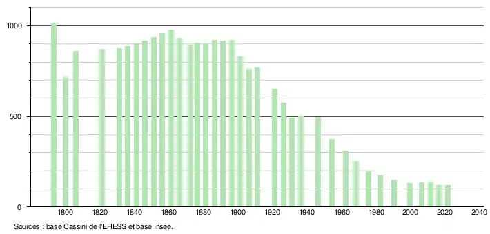 L'évolution du nombre d'habitants est connue à travers les recensements de la population effectués dans la commune depuis 1793. Pour les communes de moins de 10 000 habitants, une enquête de recensement portant sur toute la population est réalisée tous les cinq ans, les populations légales des années intermédiaires étant quant à elles estimées par interpolation ou extrapolation[15]. Pour la commune, le premier recensement exhaustif entrant dans le cadre du nouveau dispositif a été réalisé en 2006[16].