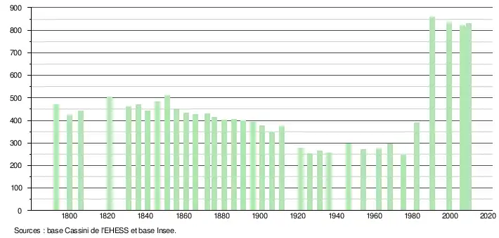 L'évolution du nombre d'habitants est connue à travers les recensements de la population effectués dans la commune depuis 1793. À partir du , les populations légales des communes sont publiées annuellement dans le cadre d'un recensement qui repose désormais sur une collecte d'information annuelle, concernant successivement tous les territoires communaux au cours d'une période de cinq ans. Pour les communes de moins de 10 000 habitants, une enquête de recensement portant sur toute la population est réalisée tous les cinq ans, les populations légales des années intermédiaires étant quant à elles estimées par interpolation ou extrapolation[7]. Pour la commune, le premier recensement exhaustif entrant dans le cadre du nouveau dispositif a été réalisé en [8],[Note 1].