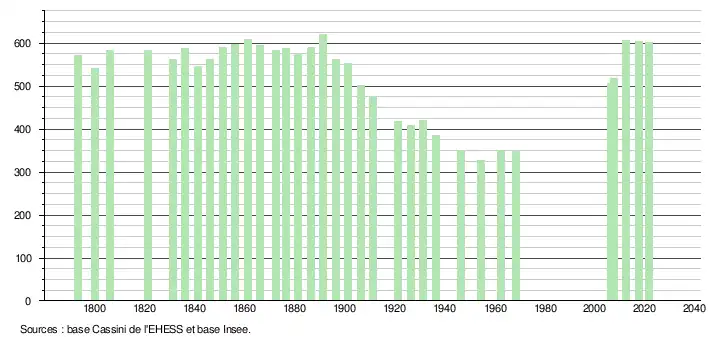 L'évolution du nombre d'habitants est connue à travers les recensements de la population effectués dans la commune depuis 1793. Pour les communes de moins de 10 000 habitants, une enquête de recensement portant sur toute la population est réalisée tous les cinq ans, les populations légales des années intermédiaires étant quant à elles estimées par interpolation ou extrapolation[12]. Pour la commune, le premier recensement exhaustif entrant dans le cadre du nouveau dispositif a été réalisé en 2007[13].