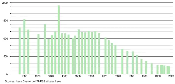L'évolution du nombre d'habitants est connue à travers les recensements de la population effectués dans la commune depuis 1793. Pour les communes de moins de 10 000 habitants, une enquête de recensement portant sur toute la population est réalisée tous les cinq ans, les populations légales des années intermédiaires étant quant à elles estimées par interpolation ou extrapolation[6]. Pour la commune, le premier recensement exhaustif entrant dans le cadre du nouveau dispositif a été réalisé en 2004[7].