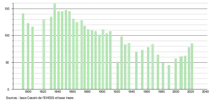 L'évolution du nombre d'habitants est connue à travers les recensements de la population effectués dans la commune depuis 1793. Pour les communes de moins de 10 000 habitants, une enquête de recensement portant sur toute la population est réalisée tous les cinq ans, les populations légales des années intermédiaires étant quant à elles estimées par interpolation ou extrapolation[22]. Pour la commune, le premier recensement exhaustif entrant dans le cadre du nouveau dispositif a été réalisé en 2007[23].