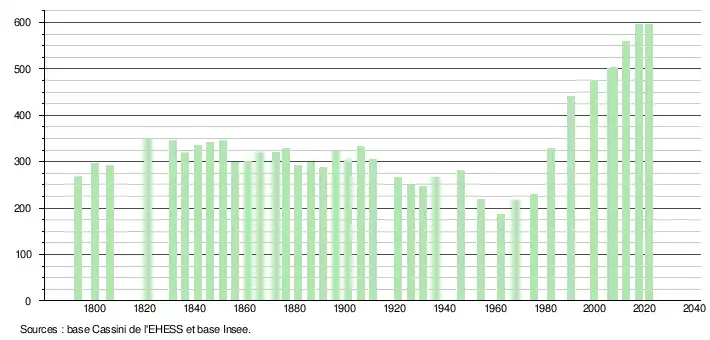 L'évolution du nombre d'habitants est connue à travers les recensements de la population effectués dans la commune depuis 1793. Pour les communes de moins de 10 000 habitants, une enquête de recensement portant sur toute la population est réalisée tous les cinq ans, les populations légales des années intermédiaires étant quant à elles estimées par interpolation ou extrapolation[16]. Pour la commune, le premier recensement exhaustif entrant dans le cadre du nouveau dispositif a été réalisé en 2007[17].