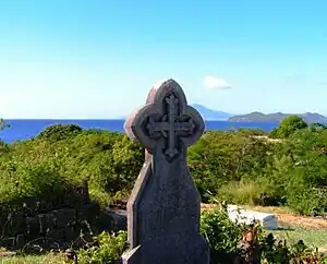 Vue depuis le cimetière de l'église paroissiale de Saint-Thomas, Nevis, Îles sous le vent, West Indies. Visible au loin est St. Kitts.