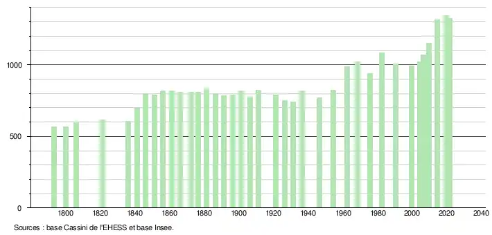 L'évolution du nombre d'habitants est connue à travers les recensements de la population effectués dans la commune depuis 1793. Pour les communes de moins de 10 000 habitants, une enquête de recensement portant sur toute la population est réalisée tous les cinq ans, les populations légales des années intermédiaires étant quant à elles estimées par interpolation ou extrapolation[17]. Pour la commune, le premier recensement exhaustif entrant dans le cadre du nouveau dispositif a été réalisé en 2004[18].