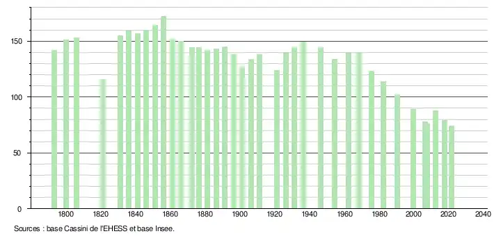 L'évolution du nombre d'habitants est connue à travers les recensements de la population effectués dans la commune depuis 1793. Pour les communes de moins de 10 000 habitants, une enquête de recensement portant sur toute la population est réalisée tous les cinq ans, les populations légales des années intermédiaires étant quant à elles estimées par interpolation ou extrapolation[19]. Pour la commune, le premier recensement exhaustif entrant dans le cadre du nouveau dispositif a été réalisé en 2007[20].