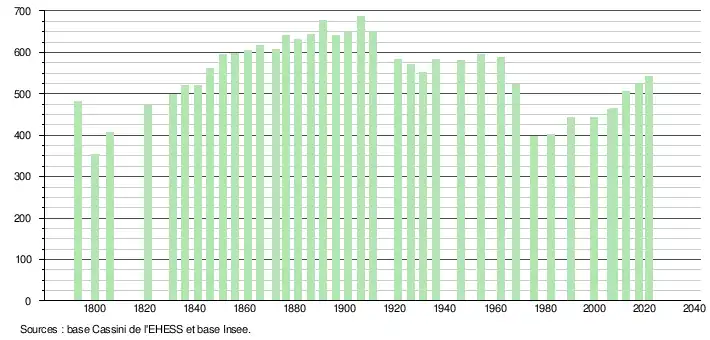 L'évolution du nombre d'habitants est connue à travers les recensements de la population effectués dans la commune depuis 1793. Pour les communes de moins de 10 000 habitants, une enquête de recensement portant sur toute la population est réalisée tous les cinq ans, les populations légales des années intermédiaires étant quant à elles estimées par interpolation ou extrapolation[16]. Pour la commune, le premier recensement exhaustif entrant dans le cadre du nouveau dispositif a été réalisé en 2007[17].