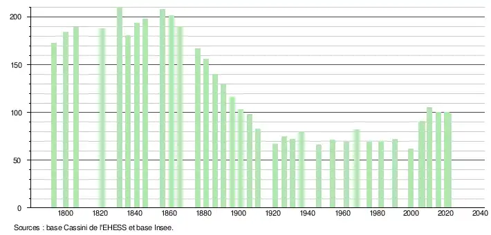 L'évolution du nombre d'habitants est connue à travers les recensements de la population effectués dans la commune depuis 1793. Pour les communes de moins de 10 000 habitants, une enquête de recensement portant sur toute la population est réalisée tous les cinq ans, les populations légales des années intermédiaires étant quant à elles estimées par interpolation ou extrapolation[18]. Pour la commune, le premier recensement exhaustif entrant dans le cadre du nouveau dispositif a été réalisé en 2005[19].