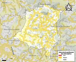 Le retrait-gonflement des sols argileux est susceptible d'engendrer des dommages importants aux bâtiments en cas d’alternance de périodes de sécheresse et de pluie. 40,8 % de la superficie communale est en aléa moyen ou fort (33,6 % au niveau départemental et 48,5 % au niveau national). Sur les 950 bâtiments dénombrés sur la commune en 2019, 447 sont en aléa moyen ou fort, soit 47 %, à comparer aux 25 % au niveau départemental et 54 % au niveau national. Une cartographie de l'exposition du territoire national au retrait gonflement des sols argileux est disponible sur le site du BRGM[14],[Carte 2].