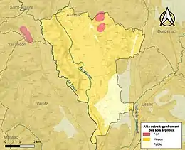 La commune est vulnérable au risque de mouvements de terrains constitué principalement du retrait-gonflement des sols argileux[23]. Cet aléa est susceptible d'engendrer des dommages importants aux bâtiments en cas d’alternance de périodes de sécheresse et de pluie. 86,9 % de la superficie communale est en aléa moyen ou fort (26,8 % au niveau départemental et 48,5 % au niveau national). Sur les 831 bâtiments dénombrés sur la commune en 2019, 667 sont en aléa moyen ou fort, soit 80 %, à comparer aux 36 % au niveau départemental et 54 % au niveau national. Une cartographie de l'exposition du territoire national au retrait gonflement des sols argileux est disponible sur le site du BRGM[24],[Carte 2].