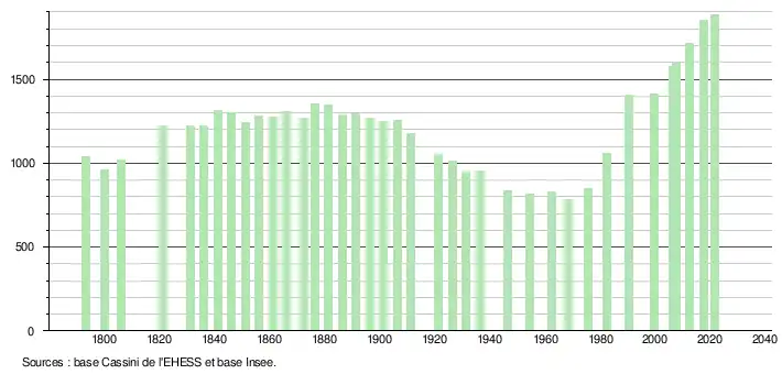 L'évolution du nombre d'habitants est connue à travers les recensements de la population effectués dans la commune depuis 1793. Pour les communes de moins de 10 000 habitants, une enquête de recensement portant sur toute la population est réalisée tous les cinq ans, les populations légales des années intermédiaires étant quant à elles estimées par interpolation ou extrapolation[30]. Pour la commune, le premier recensement exhaustif entrant dans le cadre du nouveau dispositif a été réalisé en 2007[31].