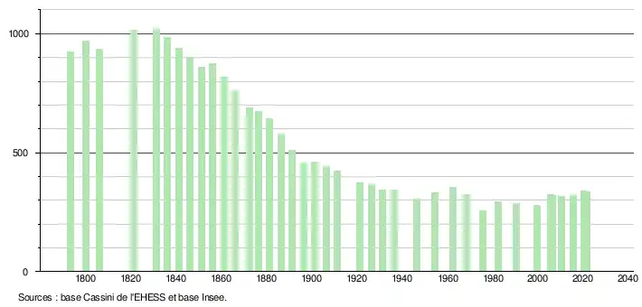 L'évolution du nombre d'habitants est connue à travers les recensements de la population effectués dans la commune depuis 1793. Pour les communes de moins de 10 000 habitants, une enquête de recensement portant sur toute la population est réalisée tous les cinq ans, les populations légales des années intermédiaires étant quant à elles estimées par interpolation ou extrapolation[19]. Pour la commune, le premier recensement exhaustif entrant dans le cadre du nouveau dispositif a été réalisé en 2005[20].