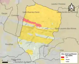 La commune est vulnérable au risque de mouvements de terrains constitué principalement du retrait-gonflement des sols argileux[15]. Cet aléa est susceptible d'engendrer des dommages importants aux bâtiments en cas d’alternance de périodes de sécheresse et de pluie. 74,3 % de la superficie communale est en aléa moyen ou fort (67,5 % au niveau départemental et 48,5 % au niveau national). Sur les 882 bâtiments dénombrés sur la commune en 2019, 882 sont en aléa moyen ou fort, soit 100 %, à comparer aux 90 % au niveau départemental et 54 % au niveau national. Une cartographie de l'exposition du territoire national au retrait gonflement des sols argileux est disponible sur le site du BRGM[16],[Carte 2].