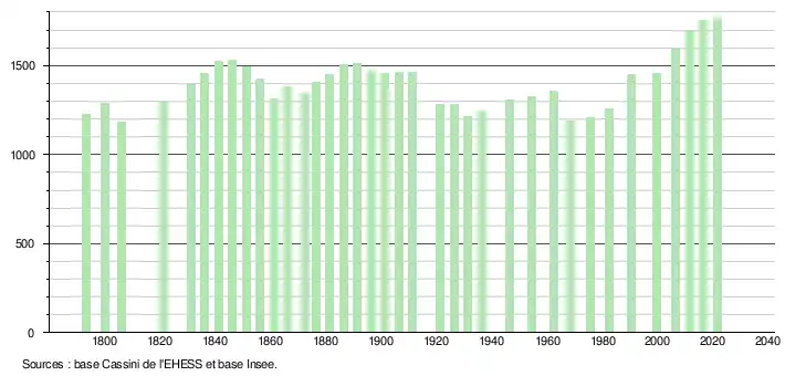 L'évolution du nombre d'habitants est connue à travers les recensements de la population effectués dans la commune depuis 1793. Pour les communes de moins de 10 000 habitants, une enquête de recensement portant sur toute la population est réalisée tous les cinq ans, les populations légales des années intermédiaires étant quant à elles estimées par interpolation ou extrapolation[27]. Pour la commune, le premier recensement exhaustif entrant dans le cadre du nouveau dispositif a été réalisé en 2006[28].