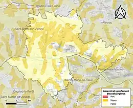 Le retrait-gonflement des sols argileux est susceptible d'engendrer des dommages importants aux bâtiments en cas d’alternance de périodes de sécheresse et de pluie[19]. 42,8 % de la superficie communale est en aléa moyen ou fort (27 % au niveau départemental et 48,5 % au niveau national métropolitain)[Carte 2]. Depuis le , en application de la loi ÉLAN, différentes contraintes s'imposent aux vendeurs, maîtres d'ouvrages ou constructeurs de biens situés dans une zone classée en aléa moyen ou fort[Note 4],[20].