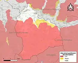 Les mouvements de terrains susceptibles de se produire sur la commune sont des tassements différentiels[41]. Le retrait-gonflement des sols argileux est susceptible d'engendrer des dommages importants aux bâtiments en cas d’alternance de périodes de sécheresse et de pluie[42]. 84 % de la superficie communale est en aléa moyen ou fort (58,6 % au niveau départemental et 48,5 % au niveau national métropolitain)[Carte 4]. Depuis le , en application de la loi ÉLAN, différentes contraintes s'imposent aux vendeurs, maîtres d'ouvrages ou constructeurs de biens situés dans une zone classée en aléa moyen ou fort[Note 6],[43].
