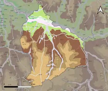 L'occupation des sols de la commune, telle qu'elle ressort de la base de données européenne d’occupation biophysique des sols Corine Land Cover (CLC), est marquée par l'importance des forêts et milieux semi-naturels (68,7 % en 2018), une proportion identique à celle de 1990 (68,8 %). La répartition détaillée en 2018 est la suivante : forêts (61,6 %), zones agricoles hétérogènes (19,2 %), prairies (9,3 %), milieux à végétation arbustive et/ou herbacée (7,1 %), terres arables (2,8 %)[35]. L'évolution de l’occupation des sols de la commune et de ses infrastructures peut être observée sur les différentes représentations cartographiques du territoire : la carte de Cassini (XVIIIe siècle), la carte d'état-major (1820-1866) et les cartes ou photos aériennes de l'IGN pour la période actuelle (1950 à aujourd'hui)[Carte 3].