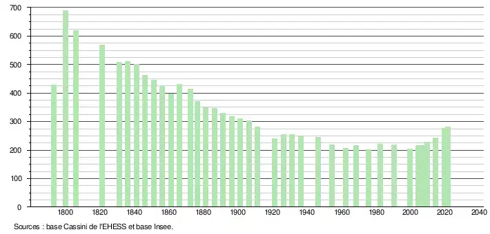 L'évolution du nombre d'habitants est connue à travers les recensements de la population effectués dans la commune depuis 1793. Pour les communes de moins de 10 000 habitants, une enquête de recensement portant sur toute la population est réalisée tous les cinq ans, les populations légales des années intermédiaires étant quant à elles estimées par interpolation ou extrapolation[29]. Pour la commune, le premier recensement exhaustif entrant dans le cadre du nouveau dispositif a été réalisé en 2004[30].
