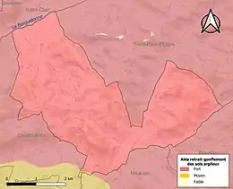 Le retrait-gonflement des sols argileux est susceptible d'engendrer des dommages importants aux bâtiments en cas d’alternance de périodes de sécheresse et de pluie. La totalité de la commune est en aléa moyen ou fort (92 % au niveau départemental et 48,5 % au niveau national). Sur les 130 bâtiments dénombrés sur la commune en 2019, 130 sont en aléa moyen ou fort, soit 100 %, à comparer aux 96 % au niveau départemental et 54 % au niveau national. Une cartographie de l'exposition du territoire national au retrait gonflement des sols argileux est disponible sur le site du BRGM[24],[Carte 3].