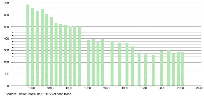 L'évolution du nombre d'habitants est connue à travers les recensements de la population effectués dans la commune depuis 1856. Pour les communes de moins de 10 000 habitants, une enquête de recensement portant sur toute la population est réalisée tous les cinq ans, les populations légales des années intermédiaires étant quant à elles estimées par interpolation ou extrapolation[30]. Pour la commune, le premier recensement exhaustif entrant dans le cadre du nouveau dispositif a été réalisé en 2007[31].
