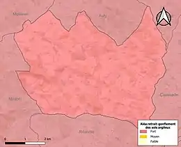 Le retrait-gonflement des sols argileux est susceptible d'engendrer des dommages importants aux bâtiments en cas d’alternance de périodes de sécheresse et de pluie. La totalité de la commune est en aléa moyen ou fort (92 % au niveau départemental et 48,5 % au niveau national). Sur les 133 bâtiments dénombrés sur la commune en 2019, 133 sont en aléa moyen ou fort, soit 100 %, à comparer aux 96 % au niveau départemental et 54 % au niveau national. Une cartographie de l'exposition du territoire national au retrait gonflement des sols argileux est disponible sur le site du BRGM[23],[Carte 3].