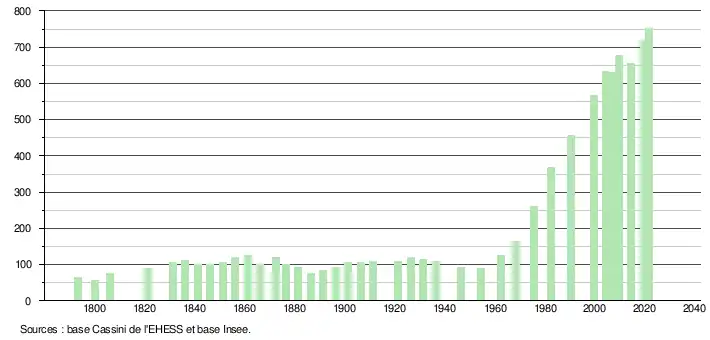 L'évolution du nombre d'habitants est connue à travers les recensements de la population effectués dans la commune depuis 1793. Pour les communes de moins de 10 000 habitants, une enquête de recensement portant sur toute la population est réalisée tous les cinq ans, les populations légales des années intermédiaires étant quant à elles estimées par interpolation ou extrapolation[20]. Pour la commune, le premier recensement exhaustif entrant dans le cadre du nouveau dispositif a été réalisé en 2004[21].