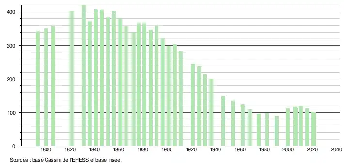 L'évolution du nombre d'habitants est connue à travers les recensements de la population effectués dans la commune depuis 1793. Pour les communes de moins de 10 000 habitants, une enquête de recensement portant sur toute la population est réalisée tous les cinq ans, les populations légales des années intermédiaires étant quant à elles estimées par interpolation ou extrapolation[14]. Pour la commune, le premier recensement exhaustif entrant dans le cadre du nouveau dispositif a été réalisé en 2005[15].