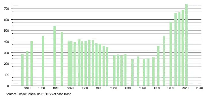 L'évolution du nombre d'habitants est connue à travers les recensements de la population effectués dans la commune depuis 1793. Pour les communes de moins de 10 000 habitants, une enquête de recensement portant sur toute la population est réalisée tous les cinq ans, les populations légales des années intermédiaires étant quant à elles estimées par interpolation ou extrapolation[12]. Pour la commune, le premier recensement exhaustif entrant dans le cadre du nouveau dispositif a été réalisé en 2006[13].