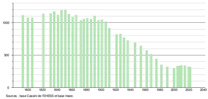 L'évolution du nombre d'habitants est connue à travers les recensements de la population effectués dans la commune depuis 1793. Pour les communes de moins de 10 000 habitants, une enquête de recensement portant sur toute la population est réalisée tous les cinq ans, les populations légales des années intermédiaires étant quant à elles estimées par interpolation ou extrapolation[22]. Pour la commune, le premier recensement exhaustif entrant dans le cadre du nouveau dispositif a été réalisé en 2004[23].