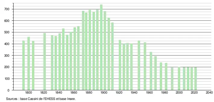 L'évolution du nombre d'habitants est connue à travers les recensements de la population effectués dans la commune depuis 1793. Pour les communes de moins de 10 000 habitants, une enquête de recensement portant sur toute la population est réalisée tous les cinq ans, les populations légales des années intermédiaires étant quant à elles estimées par interpolation ou extrapolation[18]. Pour la commune, le premier recensement exhaustif entrant dans le cadre du nouveau dispositif a été réalisé en 2006[19].