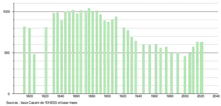 | L'évolution du nombre d'habitants est connue à travers les recensements de la population effectués dans la commune depuis 1793. Pour les communes de moins de 10 000 habitants, une enquête de recensement portant sur toute la population est réalisée tous les cinq ans, les populations légales des années intermédiaires étant quant à elles estimées par interpolation ou extrapolation[28]. Pour la commune, le premier recensement exhaustif entrant dans le cadre du nouveau dispositif a été réalisé en 2005[29]. En 2021, la commune comptait 630 habitants[Note 3], en diminution de 0,16 % par rapport à 2015 (Landes : +4,9 %, France hors Mayotte : +1,84 %). |