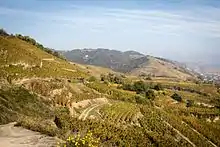 Vignoble de l'appellation saint-joseph au-dessus du château de Tournon-sur-Rhône. | |