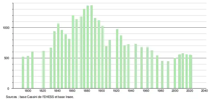L'évolution du nombre d'habitants est connue à travers les recensements de la population effectués dans la commune depuis 1793. Pour les communes de moins de 10 000 habitants, une enquête de recensement portant sur toute la population est réalisée tous les cinq ans, les populations légales des années intermédiaires étant quant à elles estimées par interpolation ou extrapolation[17]. Pour la commune, le premier recensement exhaustif entrant dans le cadre du nouveau dispositif a été réalisé en 2005[18].