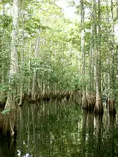 Les zones humides dans le bassin supérieur et moyen sont alimentées par l'eau de pluie, piégée par les terres environnantes. Environnement pauvre en nutriments, la végétation y pousse habituellement dans la tourbe qui est créé par la matière végétale en décomposition[17]. Le niveau de l'eau fluctue avec les saisons subtropicales humides et sèches. Des précipitations sont possibles dans le centre et nord de la Floride en été et hiver mais se produisent rarement plus au sud en hiver[18]. Toutes les plantes qui vivent dans ces bassins tolèrent ces fluctuations de niveau d'eau, y compris dans le cadre d'inondations et de sécheresse. Magnolia virginiana, Taxodium et Nyssa biflora sont courants dans cette région, sur des terres appelées hammocks[17]. Les troncs des arbres qui ont leurs racines dans l'eau sur de longues périodes sont généralement enchevêtrés dans des formes étranges pour obtenir l'oxygène sous l'eau, mais la majorité de la vie végétale est aquatique. Cette dernière inclus le nénuphar Nymphaea odorata, des plantes carnivores et l’iris Iris virginica (en). Dans les points les plus méridionaux du fleuve, du Cladium pousse dans de vastes zones de prairies humides qui étaient à une époque courant dans les Everglades[19]. Cette flore filtre remarquablement bien les polluants qui pourraient se retrouver dans le cours d'eau[20].