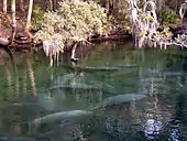 Le lit du fleuve tourne vers le nord à nouveau alors qu'il passe à travers un bassin de 190 kilomètres carrés à travers les comtés de Putnam, de Lake, de Marion et la partie occidentale du comté de Volusia. Légèrement au nord de la Wekiva se trouve Blue Spring, la plus grande source du Saint Johns avec plus de 240 000 000 litres par jour[32]. Les sources de Floride restent à une température de 22 °C tout au long de l'année. Pour cette raison, Blue Spring est occupé l'hiver par de lamantins des Caraïbess (Trichechus manatus) qui sont protégés dans le parc d'État de Blue Spring (en). Les lamantins sont de grands mammifères herbivores dont la principale menace est le développement humain et les collisions avec les embarcations humaines rapides. De nombreuses parties du Saint Johns et de ses affluents sont des zones « interdites au sillages » pour protéger les lamantins d'être blessés par les hélices des bateaux[33]. L'interaction humaine avec les lamantins dans le parc d'État de Blue Spring est également interdite[34].