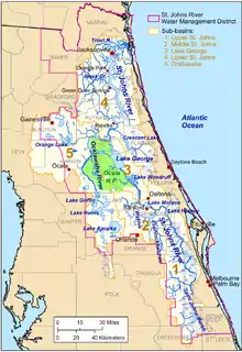 Sur 60 kilomètres, le fleuve passe à travers un bassin de 3 100 kilomètres carrés principalement alimenté par des sources et le ruissellement des eaux pluviales. Ce bassin, couvrant une partie des comtés d'Orange, de Lake, de Volusia et de Seminole, est le foyer de la grande région métropolitaine d'Orlando où deux millions de personnes résident et où de nombreuses attractions touristiques sont situées[21]. La topographie du bassin moyen varie entre des rives clairement distinguables le long du lit du fleuve et de vastes lacs peu profonds. Deux des plus grands lacs de ce bassin sont créés par le cours d'eau : le lac Harney (en) et le lac Monroe (en). Peu profond, le lac Harney, d'une superficie de 23 kilomètres carrés, est alimenté par le long et étroit lac Puzzle (en), immédiatement au nord de la rivière Econlockhatchee, laquelle rejoint le Saint Johns et y augmente son volume d'eau ce qui permet une meilleure navigation des bateaux. Le fleuve vire à l'ouest, touchant le lac Jesup (en) avant de se jeter dans le lac Monroe, en passant de la ville de Sanford. Le lac Monroe est un grand lac de 39 kilomètres carrés avec une profondeur moyenne de 2,4 mètres, drainant un bassin de 6 300 kilomètres carrés[22]. Sanford s'est adapté au lac en construisant une partie de son centre-ville sur le front du lac, ce qui fait qu'une partie des transports publics dans la ville peuvent se faire par bateau[23].