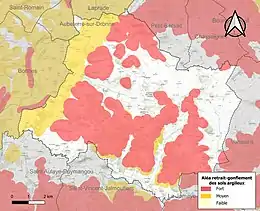 Les mouvements de terrains susceptibles de se produire sur la commune sont des tassements différentiels[40]. Le retrait-gonflement des sols argileux est susceptible d'engendrer des dommages importants aux bâtiments en cas d’alternance de périodes de sécheresse et de pluie[41]. 59 % de la superficie communale est en aléa moyen ou fort (58,6 % au niveau départemental et 48,5 % au niveau national métropolitain)[42]. Depuis le , en application de la loi ÉLAN, différentes contraintes s'imposent aux vendeurs, maîtres d'ouvrages ou constructeurs de biens situés dans une zone classée en aléa moyen ou fort[Note 5],[43].