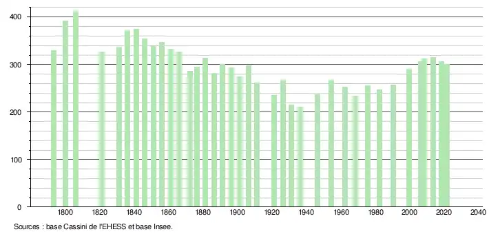 L'évolution du nombre d'habitants est connue à travers les recensements de la population effectués dans la commune depuis 1793. Pour les communes de moins de 10 000 habitants, une enquête de recensement portant sur toute la population est réalisée tous les cinq ans, les populations légales des années intermédiaires étant quant à elles estimées par interpolation ou extrapolation[26]. Pour la commune, le premier recensement exhaustif entrant dans le cadre du nouveau dispositif a été réalisé en 2008[27].