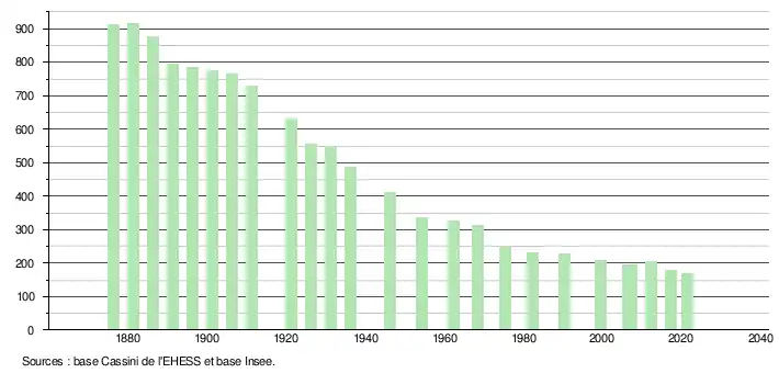 L'évolution du nombre d'habitants est connue à travers les recensements de la population effectués dans la commune depuis 1876. Pour les communes de moins de 10 000 habitants, une enquête de recensement portant sur toute la population est réalisée tous les cinq ans, les populations légales des années intermédiaires étant quant à elles estimées par interpolation ou extrapolation[24]. Pour la commune, le premier recensement exhaustif entrant dans le cadre du nouveau dispositif a été réalisé en 2007[25].