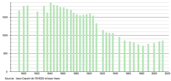 L'évolution du nombre d'habitants est connue à travers les recensements de la population effectués à Sainte-Alvère depuis 1793. À partir du XXIe siècle, les recensements des communes de moins de 10 000 habitants ont lieu tous les cinq ans (2007 et 2012 pour Sainte-Alvère[22]). Depuis 2006, les autres dates correspondent à des estimations légales. En 2015, dernière année en tant que commune indépendante, Sainte-Alvère comptait 821 habitants.